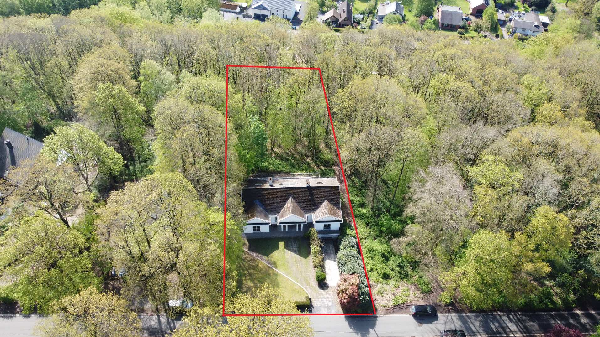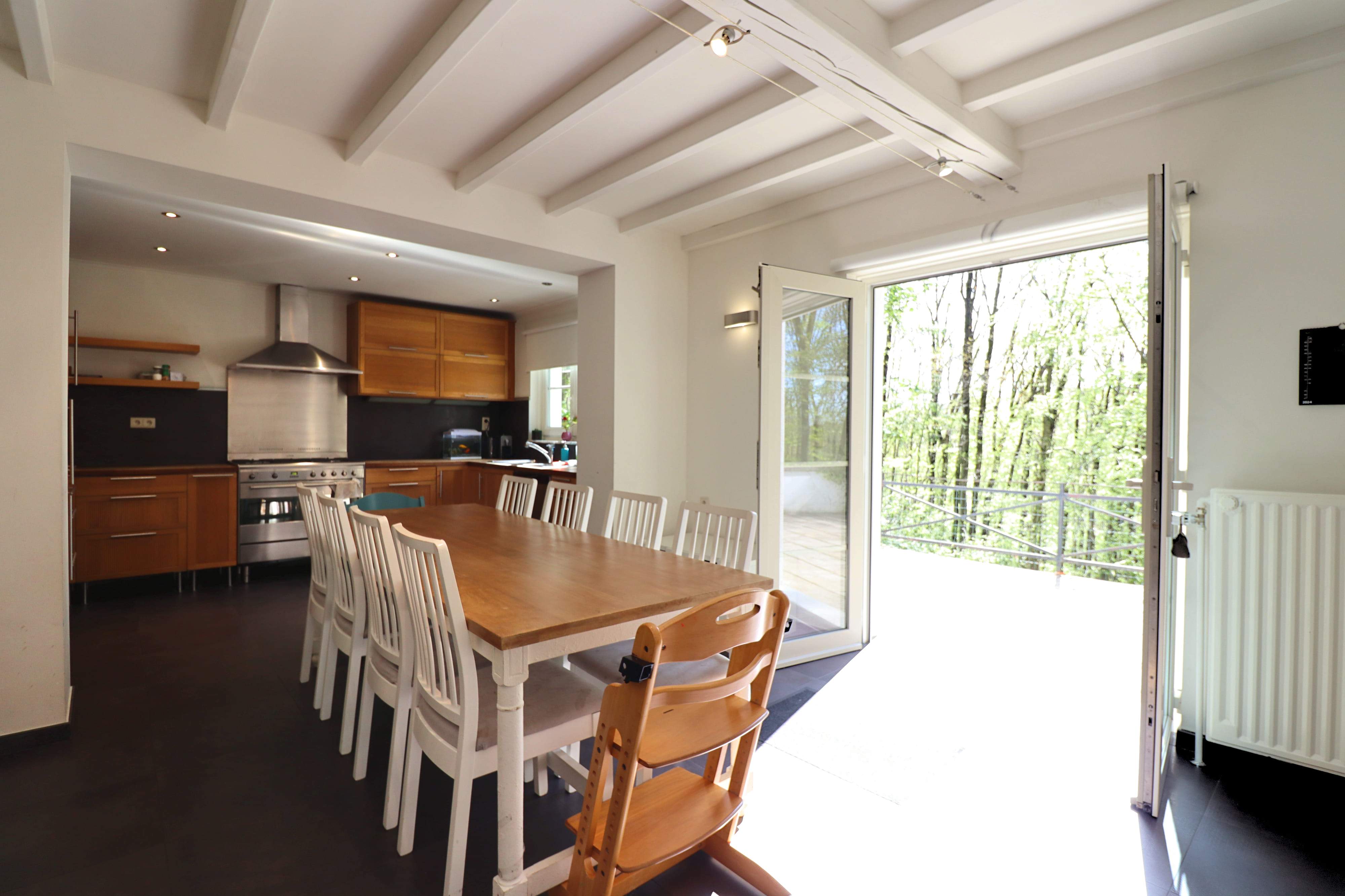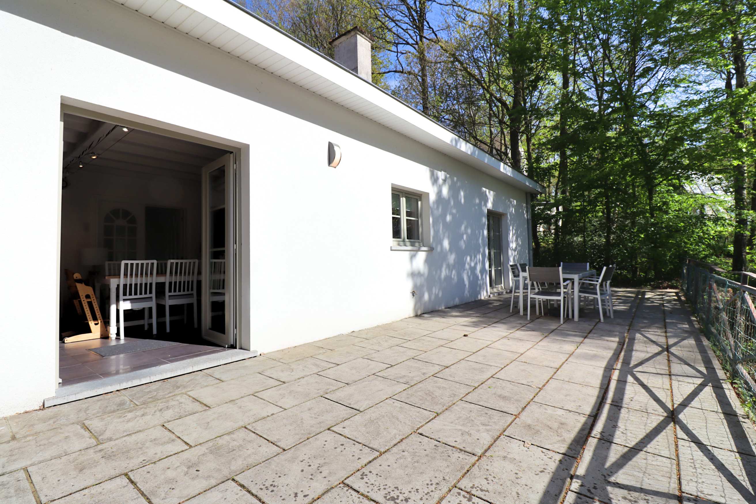 - Grande terrasse donnant sur le bois, jardin à l'avant et parking.